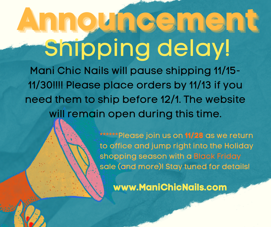 Welcome to Mani Chic! Products are handmade & filled to order. Please allow 5-10 business days processing time (may be extended during sales). Orders $40+ qualify for $5 flat rate shipping. Be sure to join our group on facebook for exciting giveaways and sale announcements! https://www.facebook.com/groups/1023111141389735