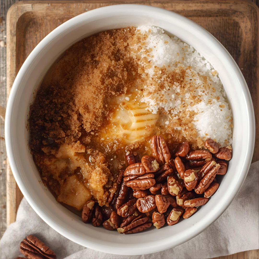 Caramelized butter and Sugar, Cinnamon and brown sugar, chopped pecans, caramel and vanilla. Sweet and cozy.